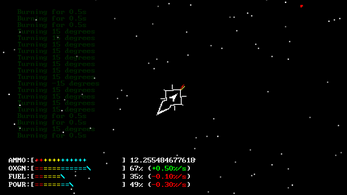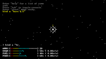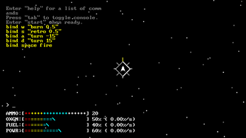 Input commands via the console or bind commands to your keyboard and try to fight against the ai opponent. After using the start command your compass will point in the direction of the enemy. To conserve power and/or fuel you can disable ship systems like navigation and life support. A full list of ship systems and their id is available through the "systems" command.